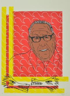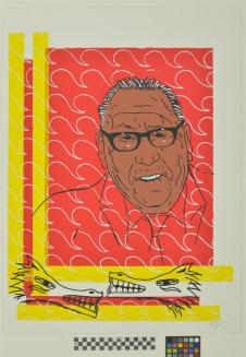 DescriptionPortrait of individual wearing glasses and a tie, on red background with wave pattern and the heads of two dog-like creatures below.Status