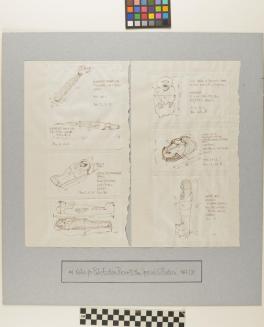 Descriptionsix sketches on individual pieces of unlined paper that have been glued to two larger pieces of lined paper. The sketches indicate dimensions and include written notesStatus