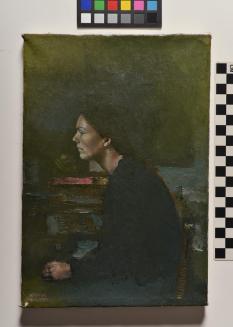 Descriptiondark portrait of a hunched, seated woman in profileStatus