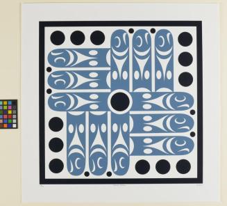 DescriptionSquare geometric design in blues and black depicting twelve salmon.Status