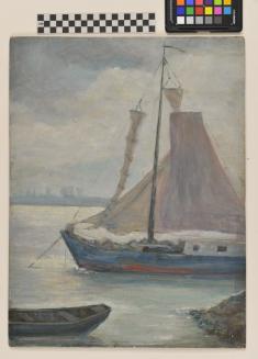 DescriptionSailboat moored in the harbour, smoke on the horizon, smaller boats in the foreground.Status
