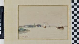 DescriptionSeascape; sailboats and shoreline with silhouettes of buildings.Status