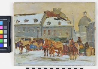 DescriptionWinter scene of horses and carriages waiting in front of the Bon Secours Market in Montreal.Status