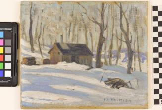 DescriptionSmall sugar shack in the snow surrounded by naked trees, a few logs in the foreground.Status
