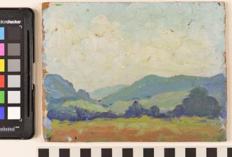 DescriptionLandscape with rolling hills and cloudy sky, in blues, greens and browns.Status