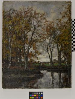 DescriptionFall scene with trees shedding their yellow leaves, bordering a river, cows grazing in the background.Status