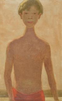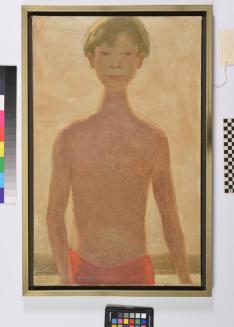 DescriptionPortrait of a smiling, slender young man in a red bathing suit against a cream-coloured background, sliver of a beach visible.Status