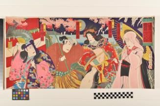 DescriptionTriptych depiction of Ichiwaka Danjuro IX, one of Japan's most famous Kabuki actors, playing four roles. From left to right: Yasuna in a pink and purple kimono holding a fan over his head, a fisherman with his trident trying to catch a carp, the Goddess Benten in red playing a lute (or biwa), and the Heron Maiden in her pink kimono and black obi, holding a large umbrella.Status