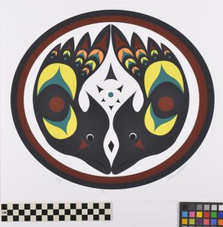 DescriptionCircular design with two jays meeting each other at the bottom of a black circle.Status
