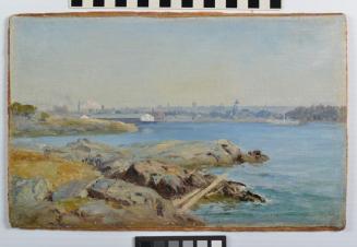 DescriptionLandscape depicting Victoria's Inner Harbour at a distance, with the dome of the BC Parliament Building, warehouses and smoke stacks dominating the city line. Rock formations and driftwood in the foreground.Status