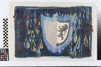 DescriptionBright light blue and white heraldic crest with a lion first half and an empty white second half. The crest is surrounded by colorful drops on a dark black and blue background. Underlayer of writing is visible but not easily decipherable.