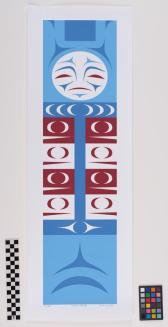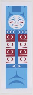 DescriptionDesign of a Coast Salish house post with the face of the moon at the top, in blues, red and white.