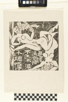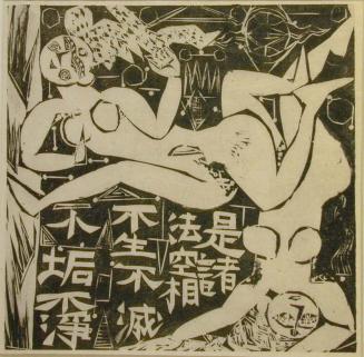 DescriptionTwo white female nudes float freely in space while the text, in unequivocally squared off calligraphy, reads: (O Sariputra, all such things are Mu form) Not born, not destroyed. Not stained, not pure (without loss, without gain)