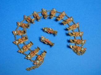 DescriptionNecklace is made up of 16 figures made of coral ? set in brass, each figure is playing a turquoise ? drum & wears a large head piece. Each figure has a tiny carved face, some worn more than others. Figures are connected by two strands of link chain.Status