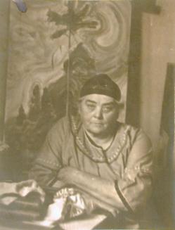 Descriptionblack and white portrait of Emily Carr in her studio with the painting "Sunshine and Tumult" in the background;Status