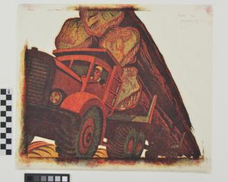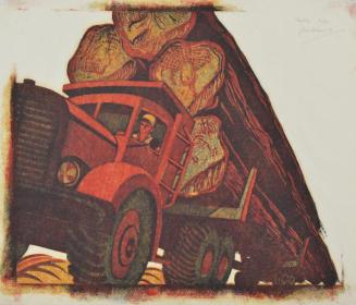 Descriptionlogging truck loaded with logs; driver at wheelColour: red; yellow ochre; grey green; grey brown