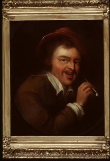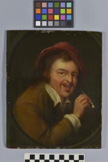 Descriptionportrait of a man wearing a red hat and holding a pipeStatus