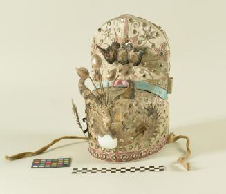 Descriptionwhite silk over a light wooden core; embroidered flower & scroll patterns in silver thread; little mirrors are regularly spaced on the hat; flat cut-out designs of a butterfly, feathers & moth or bat in silver; the large central butterfly surmounts a piece of oblong white porcelain shaped to look like a plaque of white jade; the crown is joined to a taller crest; two pieces of cottom fabric are found behind the position of the ears, probably for tying beneath the chinStatus