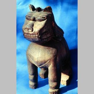 DescriptionKoma-inu means dog of Koryo, after the dynasty in medieval Korea. It was undoubtedly carved as one of a pair intended to be door guardians at a Shinto shrine. While this wood sculpture is rather crude, due to the dimensions of the block of wood, it still exhibits a folksy primitive power and retains its symbolic impact as a protective guardian. The craftsman who carved the piece demonstrates his inability to articulate from much beyond the shape of the block of wood. The work appears to have probably been done in the isolation of a rural mountain village