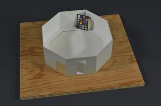 Descriptionarchitectural maquette represents an octagonal room with a doorway, resting on a plain square shaped wooden base; interior of the room has a raised walkway around the walls, having a slightly sunken octagonal space in the floor; on one exterior wall there is a brown paper rectangle, which resembles a doorway; a wooden figure is on the walkway; plexiglass cover;Status