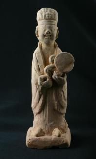 DescriptionFigurine of a standing court official in a long robe with hands in front holding objects, one of which is circular. It rests on a small square base.Status