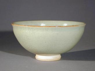 Descriptionceladon green; rounded bowl shape with slightly flared lip, base has a base rim stem that is hollow; crackled celadon glazeStatus