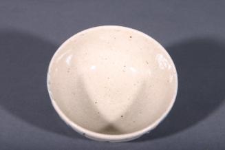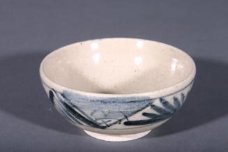 DescriptionUnderglaze blue painting on upper portion of outside rim & clear glaze reveals greyish buff stoneware body. Curved sidesStatus