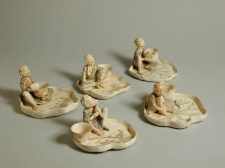 DescriptionIvory white crackle glaze - Floral design in gold with red, blue & green highlights on dish & bowl. Man seated holding fly whisk, bowl is at his side & he is dressed in striped robe - green, gold , black & red gold white vest.Status