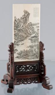 DescriptionTwo sided rectangular ivory plague has a depiction of a landscape scene with text on either side. One scene is of a mountainous valley with a waterfall and trees and the otherside has a body of water with surrounding mountains and rocky outcrops and trees.Status