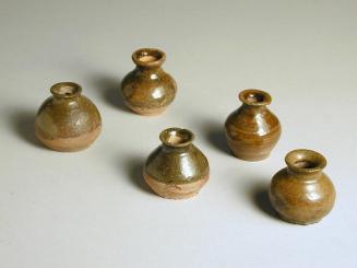 DescriptionCrudely made of red & brown clay covered by an olive-brown glaze with the lower portion exposed. Base has itogiri marks (whirlpool impressions left on the base when the potter cuts it from the wheel)Status