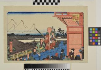 DescriptionThe foreground is the near view of a temple; the priest with a headdress of pine boughs & carrying a very long sword is mounting the stairs, followed by two other figures; spectators fill the area closest to the viewer; beyond is a sky with many kites & an open seaStatus