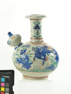 DescriptionDrinking vessel with a bulbous body and a mammiform-shaped spout on one side.Status