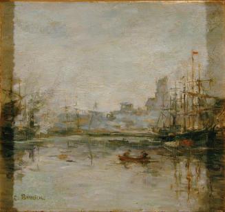 DescriptionIn the harbour are sailing ships with sails furled & a rowboat with two figures in it.Status