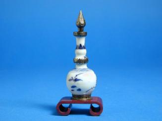 DescriptionFloral motif blue underglaze, silver base, collar, cap & stopper which is very pointed. All silver is decorated with flower motif.Status