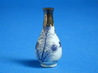 DescriptionSilver cap, blue underglaze floral motif. Silver rim has etched symbols around scalloped edge.Status