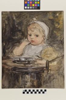 Descriptiona baby is sitting in a baby chair?, with a bowl in front of him or her & a finger in his or her mouth; head & upper body visibleStatus