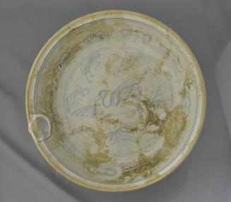 Descriptioncircular shallow bowl; white glaze with underglaze blue decoration depicting a bird at centre and bands of decorative motifsStatus
