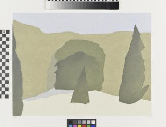 Descriptionlandscape with pine tree shapes before a wall form. Sky aboveColour: greens; blue; beige