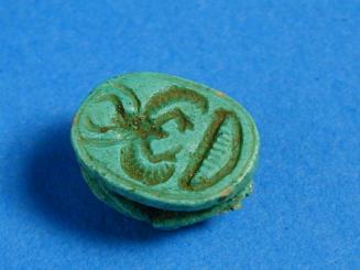 DescriptionGreen scarab with a hole drilled through body lengthways. Flat surface has an insect - a flying scarab ? & a loaf hieroglyph.Status