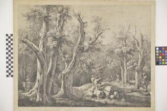 DescriptionThree men are trying to pull over an old tree. A man in the background with wood on a cart. A man on the left with a cow. A woman collects twigs.Status