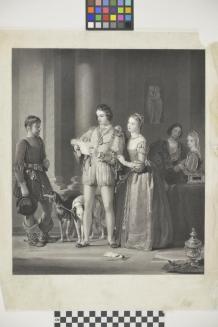 DescriptionA young man has just received a message & is reading it while a young lady rests her hands on his arm & shoulder. Two dogs stand between the young man & the messanger. Another couple look on from behind.Status